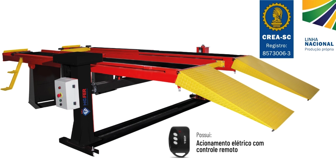 Adapta-se ao uso com alinhadores a laser, digitais ou computadorizados. É acionada por mini elevador elétrico com controle remoto e possibilita o alinhamento de rodas dianteiras e traseiras.